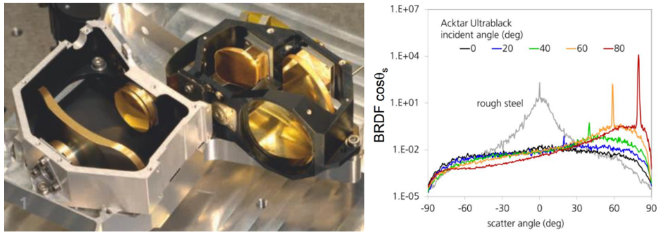 圖4. 近紅外下對Acktar[1]黑色涂層的散射測量,左圖:用于BepiColombo太空任務的紅外光譜儀;右圖:4.6  下ARS角分辨散射分布,入射角0°,10°,40°,60°,80°。
