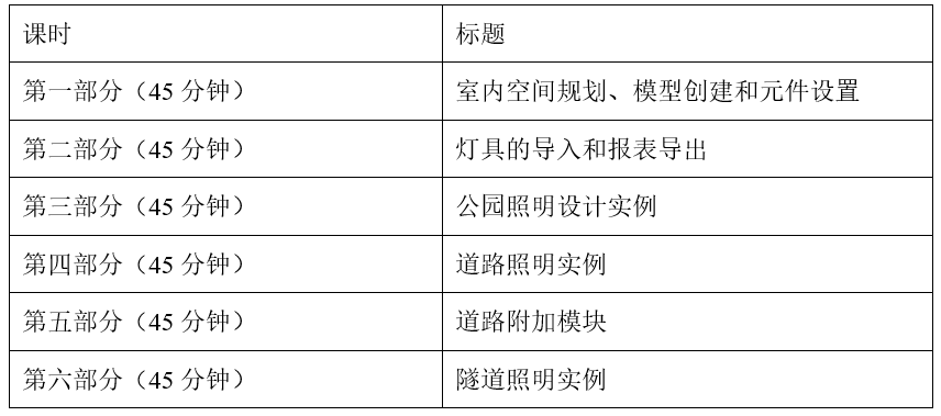 本課程的目的在于通過一些室內照明、室外照明、道路照明和隧道照明實例使用戶能更熟練的使用軟件進行照明設計。