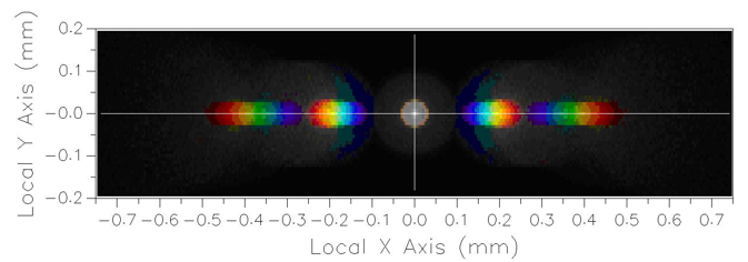 波片為通過的光的每個偏振分量提供一個差分相移。這種相移的波長依賴性意味著光束的每個顏色分量都會得到一個稍微不同的偏振調(diào)整。垂直偏振片再次濾除光的所有水平偏振分量。對于波片,偏振片以外的輻照度顯示出消光交叉圖案的減少。關(guān)于光分布的一個更有趣的觀點是它的彩色圖像,它顯示了一種彩虹色的分布。