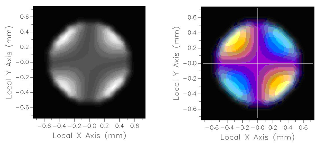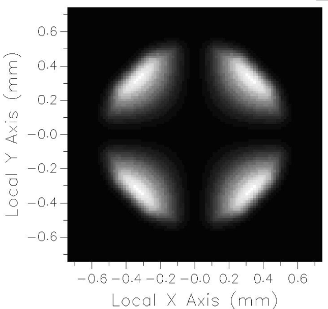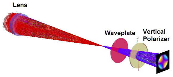 在該系統(tǒng)中,相干的水平偏振白光由透鏡聚焦。波片放置在焦點之外,然后是垂直線偏振片(圖6)。準(zhǔn)直的水平偏振光不通過偏振片,然而,水平偏振光線的擴展光束在每個角落處具有一些通過的垂直偏振分量。圖7顯示了沒有波片系統(tǒng)的輻照度。