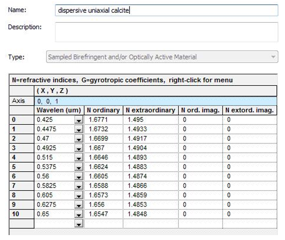接下來,添加波片(0.00304 mm厚的由雙折射方解石制成)。方解石材料是使用FRED的Sampled Birefringent and/or Optically Active Material材料類型創(chuàng)建的。方解石的規(guī)格如圖8所示。
