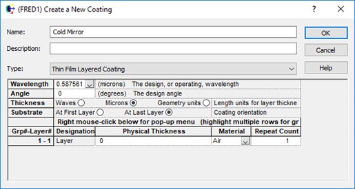 FRED中可以指定幾種膜層類型,例如采樣膜層,薄膜膜系,四分之一波長單層膜層,一般采樣膜層(入射角,波長和偏振相關),偏振片/波片膜層(瓊斯矩陣) 和腳本膜層。 在此案例中,使用Thin Film Layered Coating類型(圖1)創建冷鏡。