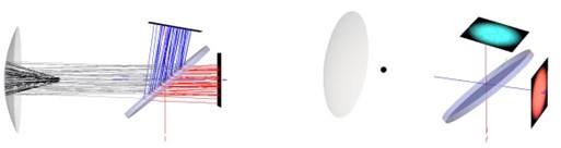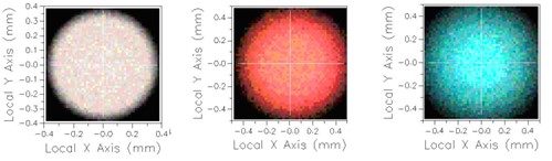 寬光譜光源對許多光學系統都很重要,應用范圍包括白光照明、分光計等。FRED中的顏色圖像分析,是通過計算每個像素的色度坐標并在表面上顯示生成的RGB值來生成顏色分布。此外,FRED還可以顯示彩色色度圖,并在用戶移動光標時指示每個像素的色度坐標。在本案例中,將觀察兩個光學系統的彩色圖像。第一個系統包括一個分色的“冷光鏡”,將白光分為兩個波長段。第二個系統利用線偏振器和波片來顯示雙折射材料的波長依賴性。