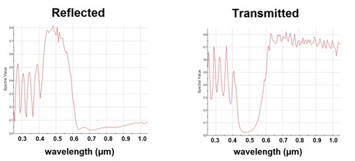 圖3. 冷光鏡反射和透射光的光譜分析。請注意,由于膜層是0度入射,0.55um為中心波長,所以在這個較大的入射角處反射較短的中心波長。