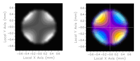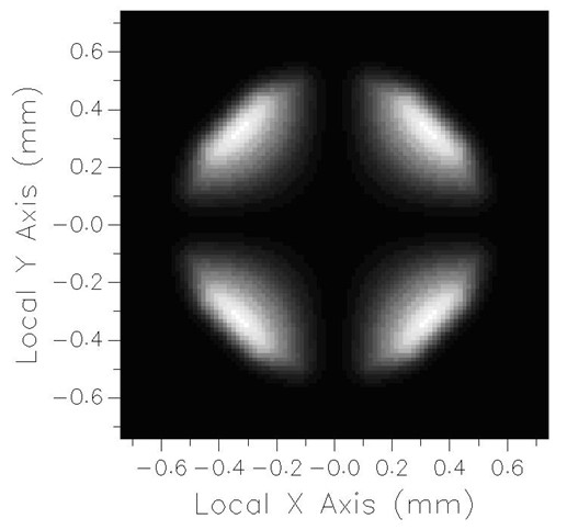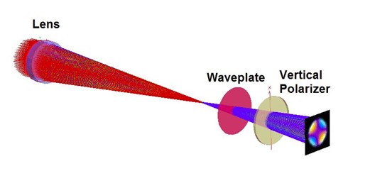 在該系統中,相干的水平偏振白光由透鏡聚焦。波片放置在焦點之外,然后是垂直線偏振片(圖6)。準直的水平偏振光不通過偏振片,然而,水平偏振光線的擴展光束在每個角落處具有一些通過的垂直偏振分量。圖7顯示了沒有波片系統的輻照度。