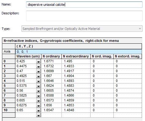 接下來,添加波片(0.00304 mm厚的由雙折射方解石制成)。方解石材料是使用FRED的Sampled Birefringent and/or Optically Active Material材料類型創建的。方解石的規格如圖8所示。