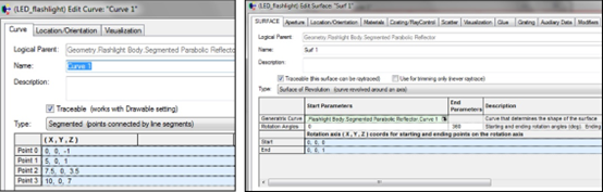 為了提高光學效率,面反射鏡恰好可以放置在LED后面。使用“自定義元件”可以創建該反射鏡,自定義元件由兩部分組成:一條曲線和一個表面。分段曲線需要每個間斷點的(X,Y,Z)坐標,用于定義反射鏡的徑向分布。該曲線在X-Z平面具有拋物線形狀,Z值正比于X^2。然后將分段曲線指定為旋轉曲面的母線。分段反射鏡曲線和表面的準確參數如圖2所示,以及已完成的反射鏡的示意圖。