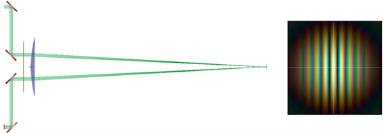 嵌入式腳本可以用于產生具有合適波長和角距的光源,來代表恒星對象。實現這個目的的一種方法是產生一對相干的平面波光源:一個光源就位于M1之前,另一個就位于M2之前。每個光源都有基于光源光譜的合適的波長和相對功率,并且在提供的角度直徑內的任意方向傳播。一旦所有的光源創建好,相干光線追跡就會執行。在探測器平面上的輻照度和彩色圖會得到計算并顯示出來。為了模擬邁克爾遜恒星干涉儀的運行,額外的循環可以添加到腳本中,它會在每一步掃描反射鏡間距并計算條紋可見度。條紋可見度的第一個極小值會出現在d=λ0/(2θ)處,其中λ0是恒星(發光)的中心波長,θ是以度為單位的角距。