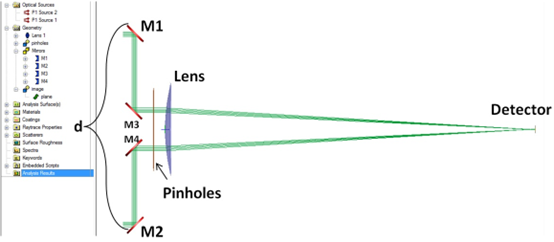 系統的幾何結構如圖1所示。干涉儀由四個反射鏡、一對小孔、一個正透鏡和一個探測儀組成。