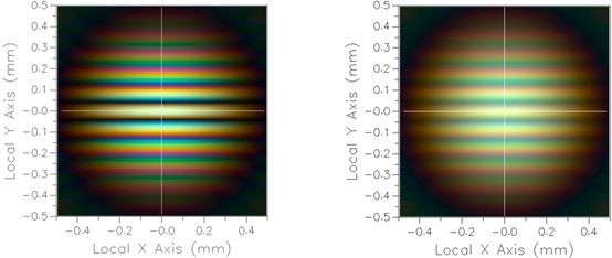圖2.左:角度范圍為1弧秒的恒星在探測器上的白光干涉圖樣,白光的中心波長為0.55um,半帶寬為0.1um。干涉儀的小孔半徑為1mm,反射鏡距離為50mm。右:增加反射鏡間距到100mm的干涉圖樣,此干涉圖的能見度降低了。