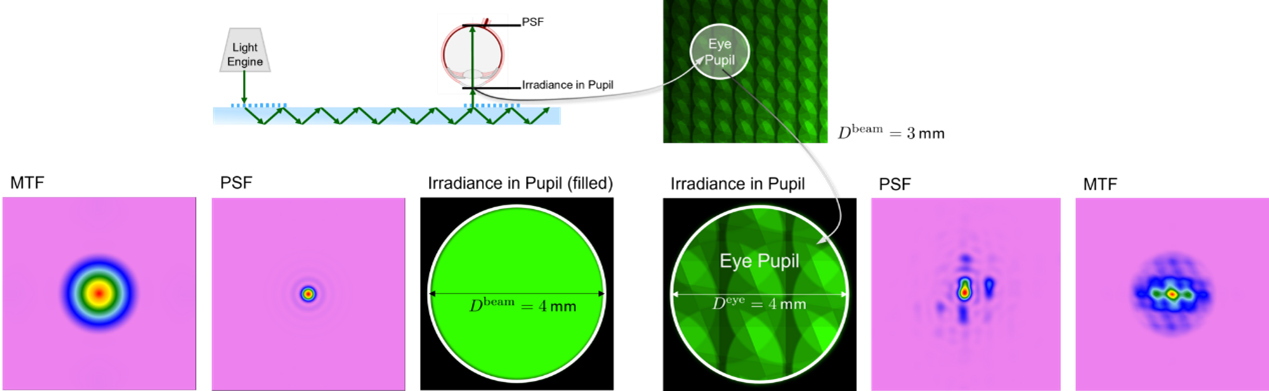 一些復雜的物理效應只是在AR/MR波導中耦合在一起影響器件最終性能的幾個復雜物理現象的例子,例如重疊光束之間的干涉及其如何影響eye-box均勻性,所采用光源的相干特性,進入系統的光的初始偏振態與系統中不同組件引入的矢量效應之間的糾纏,或者衍射對器件包括人眼的點擴散函數/調制傳遞函數的影響。