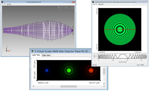 左上圖為使用光線追跡分析一個高數值孔徑透鏡系統。右上圖為一個干涉圖樣——如何在VirtualLab中表示光是課程的第一個主題。下圖為一個帶有圓形孔徑的施密特望遠鏡場追跡的仿真結果。