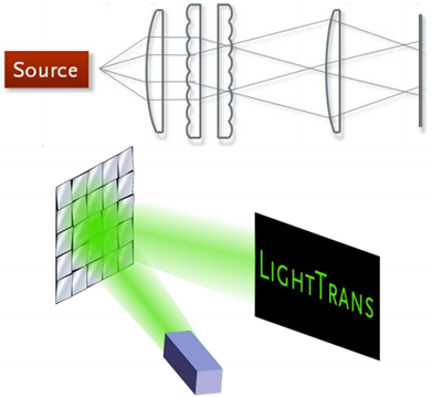 上圖為一個采用兩個微透鏡陣列進行LED光均勻化的系統原理圖——課程中將介紹具體實例和參數關系。下圖中演示了應用微反射鏡單元陣列進行LED光整形的基本概念,利用Lighting Toolbox工具箱可進行LED光整形的設計與分析——課程中將會進行案例演示。