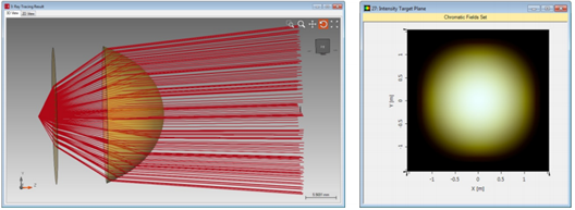左圖顯示了一個非球面LED準直透鏡的光線追跡仿真;右圖是應用幾何光場追跡+引擎在目標平面獲取的相應的強度分布。