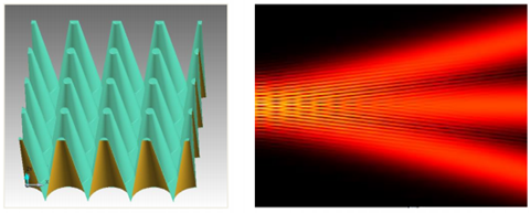 左圖為一個蛾眼結構的光學表面,右圖展示了激光光束在通過一個1:3衍射光束分光元件后的傳播情況。