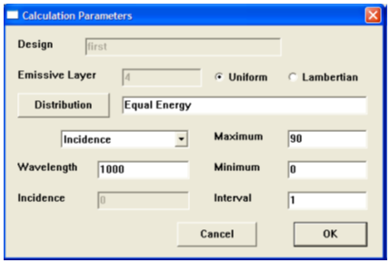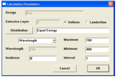 圖3和圖4給出了計算參數對話框。Design名字和emissive layer都不可編輯,僅供參考。如果選擇了正確的自變量或是腳本的默認值,則相關參數從design文件中讀取,它們可在對話框中編輯。點擊Distribution按鈕會允許一個發射層波長與輸出關系的表格以供選擇。如果不做選擇則默認使用Equal Energy。