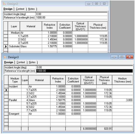 圖2.原始設計文檔(上部)通過勾選Display Setup對話框中的Medium條目添加了Medium Type和Medium Thickness列。然后將3毫米厚平行基板與背面膜層一起添加,最后將出射介質設置為空氣。