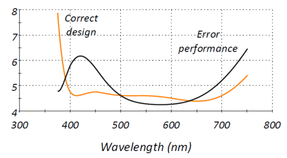 圖1.橙色曲線表示無(wú)誤差四層設(shè)計(jì)的性能,黑色曲線表示有誤差的性能。這兩條曲線都包括基板后表面的影響。