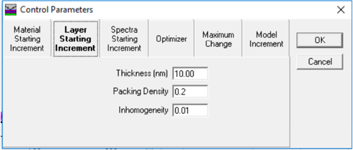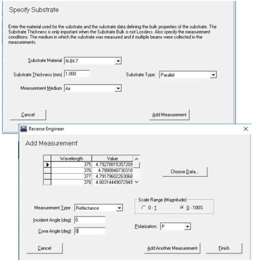 圖3.反演工程中的第二個(gè)和第三個(gè)對(duì)話框,我們?cè)谄渲休斎牖寮?xì)節(jié),然后輸入測(cè)量的性能。性能可以是反射率、透射率或橢圓參數(shù)。
