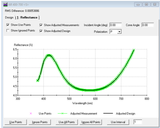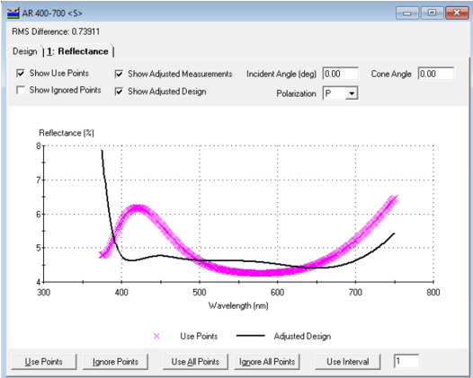 這種特殊的設(shè)計(jì)一點(diǎn)也不復(fù)雜,不太可能存在多個(gè)解決方案的問(wèn)題,因此我們將選擇simplex作為優(yōu)化技術(shù)。它的選擇反映在圖4標(biāo)題欄中的符號(hào)<s>中。另一種可能性是<de>。要繼續(xù),我們打開參數(shù)對(duì)話框,圖6,可在Adjust菜單中找到。這就是我們控制進(jìn)度的地方。Material選項(xiàng)卡基本上與工具因子有關(guān),Layer選項(xiàng)卡與各個(gè)膜層有關(guān),Spectrum選項(xiàng)卡與測(cè)量中可能出現(xiàn)的錯(cuò)誤有關(guān),盡管應(yīng)將其用作最后手段,Material Mode選項(xiàng)卡與某些表達(dá)式相匹配,History選項(xiàng)卡允許導(dǎo)航回到初始結(jié)構(gòu)和在整個(gè)過(guò)程步驟中前進(jìn)。這是一個(gè)相對(duì)簡(jiǎn)單的例子,因此我們?cè)试S所有層的厚度變化,如圖7所示。優(yōu)化實(shí)現(xiàn)得很快。擬合非常接近,一個(gè)好的指標(biāo)是0.00054的RMS Difference,這是擬合接近度的一個(gè)度量。圖8的Design選項(xiàng)卡中給出了完整的設(shè)計(jì)細(xì)節(jié)以及層厚度的百分比變化,但評(píng)估結(jié)果的快速有效方法是使用Results菜單打開繪圖。在這種情況下,我們選擇隨機(jī)厚度,并得到圖9。
