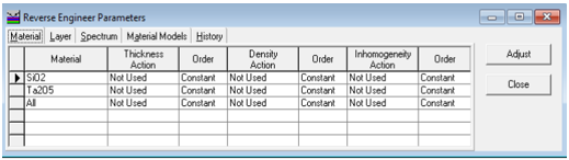 圖6.Agjust菜單是我們使用參數(shù)對(duì)話框啟動(dòng)和控制流程的地方。選項(xiàng)卡顯示我們可以改變的參數(shù)。Material選項(xiàng)卡允許所選材質(zhì)的所有層的變化。變化率可以是一個(gè)常數(shù),可以顯示,也可以在整個(gè)設(shè)計(jì)過(guò)程中線性或四次變化,這是在Order列中定義的。這基本上是工具因子的影響。