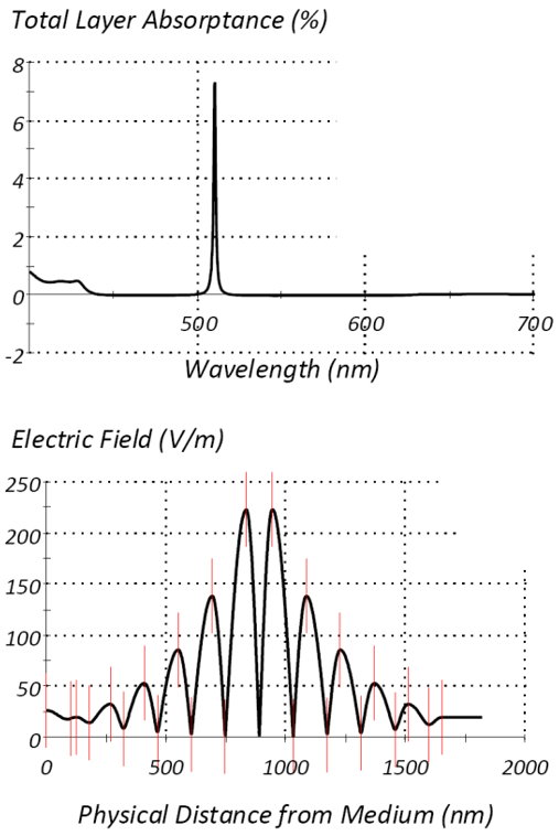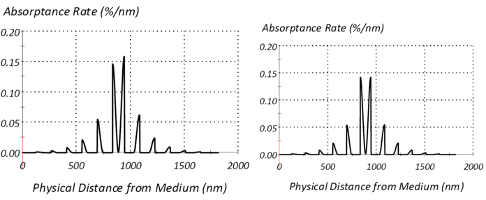 圖1顯示了使用具有無吸收低折射率材料(SiO2)和輕微吸收的高折射率材料(TiO2)薄膜的窄帶濾光片的一些結果。電場分布的平方很好地解釋了吸收率變化。勢吸收率幾乎相同,因為反射率為零,但膜層前面部分的吸收降低了墳墓上的Ienter的值,因此膜層后部的吸收率逐漸增加。