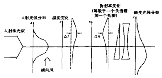 激光在大氣中傳輸時部分能量被空氣中的分子和氣溶膠吸收。被吸收的熱量將空氣加熱,導致氣壓上升,空氣膨脹,空氣密度降低,折射率下降,形成一個負透鏡,使激光束發散。當存在側向風時,下風區空氣密度降低,因而下風區的折射率減小,形成特有的彎向上風區的光束分布,使光束畸變、彎曲和發散,劣化光束質量。這就是熱暈效應。它是激光在大氣中傳輸時所面臨的嚴重問題之一。