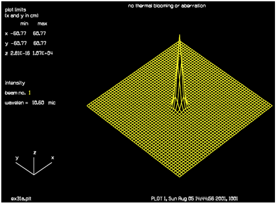 圖1.不含大氣像差和熱暈效應的遠場分布,此時光束的焦點在4km處,光斑尖銳。