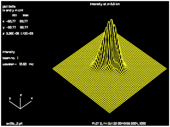 本例對比了三種情況下的激光遠場分布:(1)沒有大氣像差和熱暈效應下的遠場光強分布;(2)沒有大氣像差但有熱暈效應下的遠場光強分布;(3)同時考慮大氣像差和熱暈下的遠場分布。通過對比我們會發現熱暈效應會使光束焦點前移,焦斑沿垂直光軸方向發生位移,焦斑畸變,尺寸變大。
