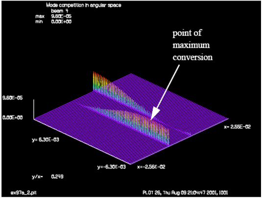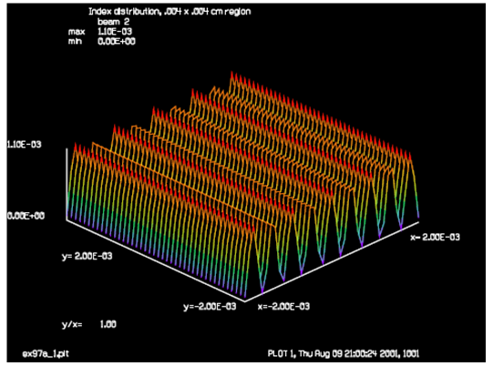 通過將干涉圖樣轉換為相位屏,GLAD能夠模擬體全息光柵。在本例中,兩束具有一定夾角的準直光束形成了干涉圖樣。該干涉圖樣對應的強度分布被轉化為相位調制分布。從而用于模擬全息記錄介質中形成的梯度折射率分布。體全息結構一旦形成,就可以在傳輸過程中將一束入射光波逐漸轉換成形成體全息結構的另一束光波。兩束光波之間的能量傳遞轉換效率與體全息結構的厚度密切相關。若厚度很薄,則入射光波轉化為另一束的效率很低,隨著厚度逐漸增加,轉換效率也隨之增加。到某一厚度時轉換效率最大,入射光束完全轉換為另一束。但是隨著厚度的進一步增加,能量又會轉換回到入射光束。