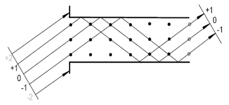 所謂ZIG-ZAG放大器是指光束在同一臺放大器傳輸多次,獲得多次放大,光束的傳輸路徑呈現(xiàn)之字型。圖1給出了由兩面反射鏡構(gòu)成的ZIG-ZAG放大器。光線-1, 0,+1可以通過ZIG-ZAG放大器進(jìn)行傳輸放大。只有光線經(jīng)過的區(qū)域反轉(zhuǎn)粒子數(shù)才會被消耗。