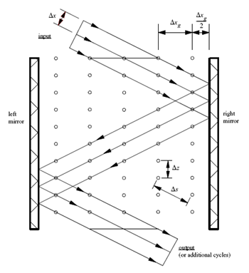 圖2.ZIG-ZAG放大器結(jié)構(gòu)示意圖,光線的路徑顯示了兩次反射構(gòu)成的完整傳輸周期