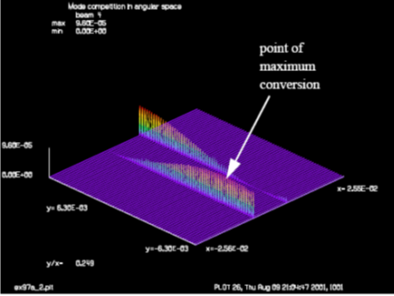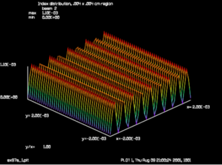 通過將干涉圖樣轉換為相位屏,GLAD能夠模擬體全息光柵。在本例中,兩束具有一定夾角的準直光束形成了干涉圖樣。該干涉圖樣對應的強度分布被轉化為相位調制分布。從而用于模擬全息記錄介質中形成的梯度折射率分布。體全息結構一旦形成,就可以在傳輸過程中將一束入射光波逐漸轉換成形成體全息結構的另一束光波。兩束光波之間的能量傳遞轉換效率與體全息結構的厚度密切相關。若厚度很薄,則入射光波轉化為另一束的效率很低,隨著厚度逐漸增加,轉換效率也隨之增加。到某一厚度時轉換效率最大,入射光束完全轉換為另一束。但是隨著厚度的進一步增加,能量又會轉換回到入射光束。