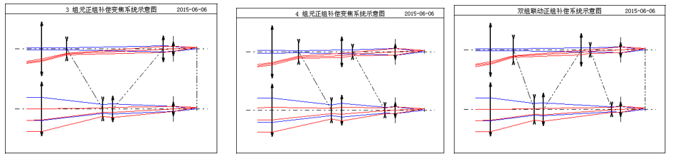 軸向位移型斷續變焦系統也可以是三組元結構、四組元結構等多種形式。設計時都是借用機械補償式連續變焦系統設計方法設計。只是對連續變焦系統運動形式的簡化。