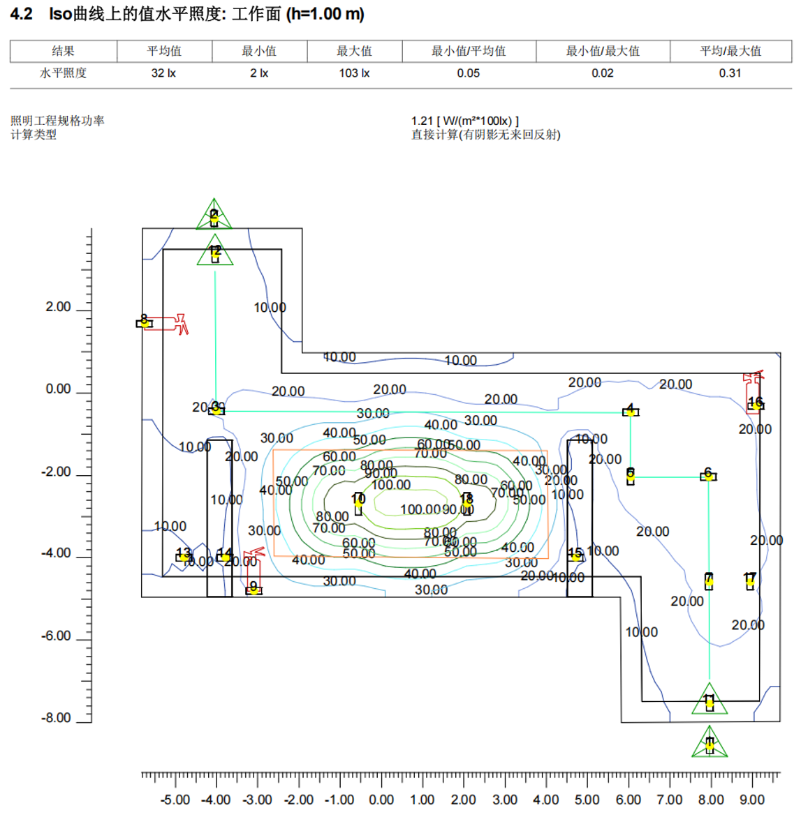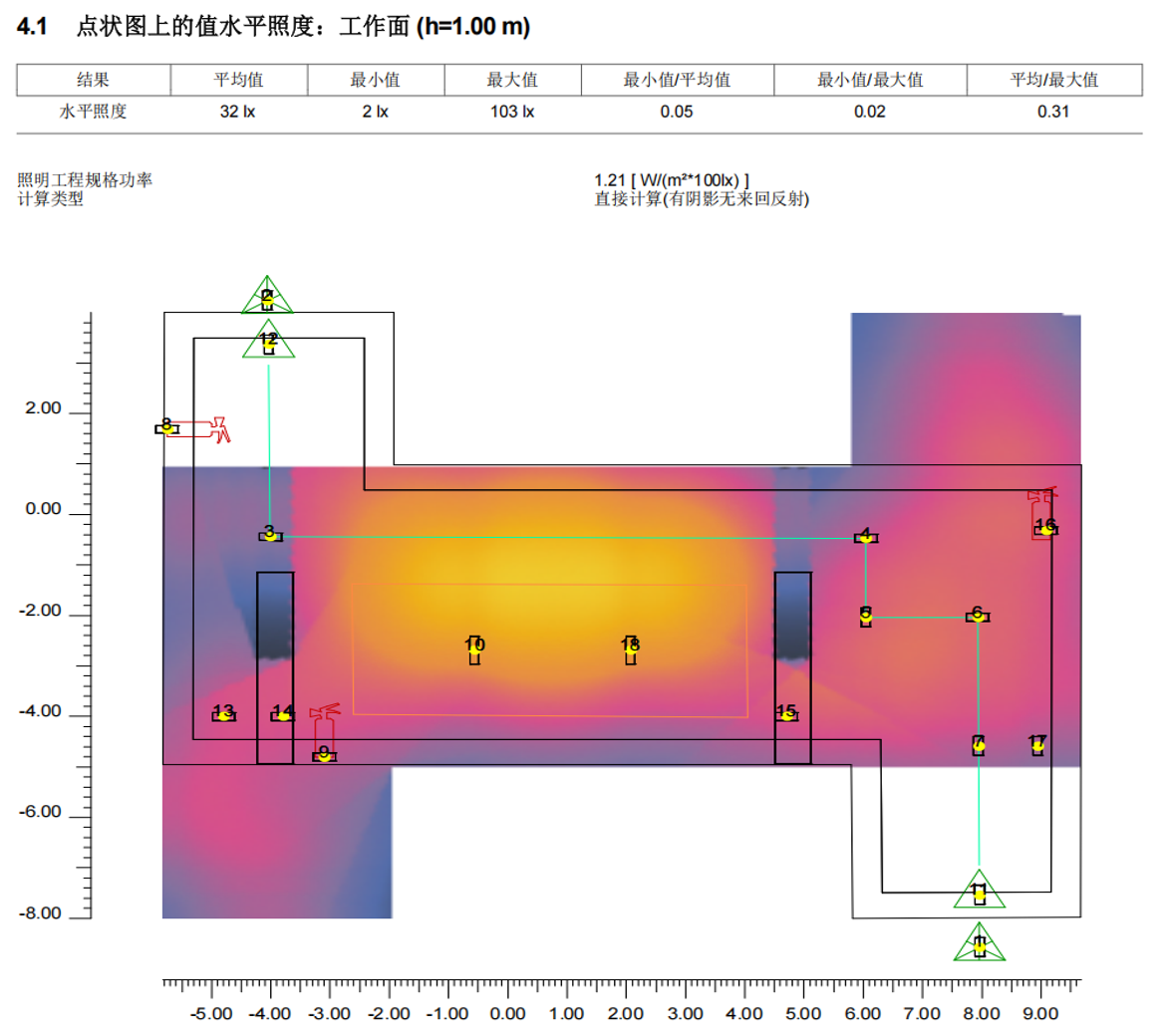 設計場所面積合理,其中布置燈具擺放合理,符合照明標準。