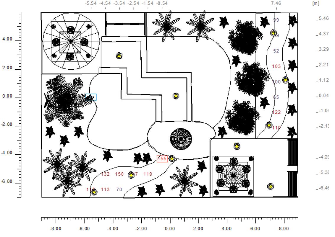 設計公園面積合理,其中布置長椅、草坪、植物、湖面等,燈具擺放合理,符合照明標準。
