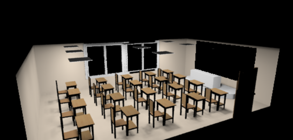 該渲染圖呈現了一個光線分布均衡、燈具擺放合理的教室場景,增強了場景的真實感。