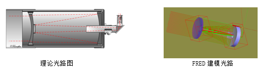 如下圖所示是馬克蘇托夫望遠鏡系統,其設計原理為折反射望遠鏡(面鏡-透鏡),設計目的為設計原理為折反射望遠鏡(面鏡-透鏡),設計目的為減少離軸的像差,如彗形像差等。