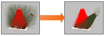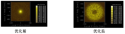 左圖是一個弧光燈的光線追跡效果,其反射罩面型為拋物線型。反射罩面型定義完成后,可以針對所需的度量量設置變量、評價函數、優化方法等,對反射罩的面型、位置等參數進行優化。下圖所示的是優化前后探測面的照度分布。