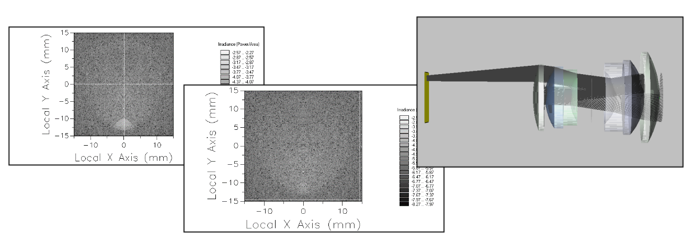 可以對光源反射罩或組合透鏡的面型進行優化,使得能夠在分析面上得到所需的照度分布,而且FRED可以生成照度分布圖,便于直觀的了解。另外,FRED還可以導入光源的光線文件,生成光線分布列表,快速建立自定義光源。