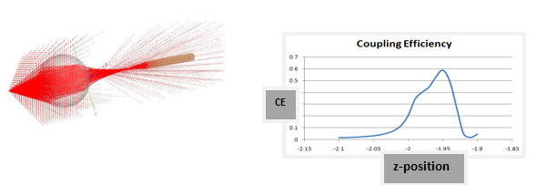 FRED可以分析單模和多模光纖耦合效率,并且自動計算出不同位置和角度對應的耦合效率關系。如下圖是球形透鏡光纖耦合系統和效率對位置的關系圖。對于更復雜的光纖(如漸變折射率)和光源,如果知道折射率分布和光源信息,可以定義詳細光源和腳本構建漸變折射率材料,并且軟件帶有多種類型的漸變折射率模型。