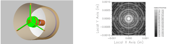 FRED能夠模擬計算孔徑、擋板和葉片等產生的衍射效應和對光機系統的影響,使得對于光機系統的模擬更接近現實。下圖是Cassegrain 望遠鏡的第二主鏡和支持結構等形成的衍射效應的分析