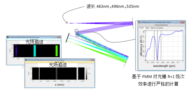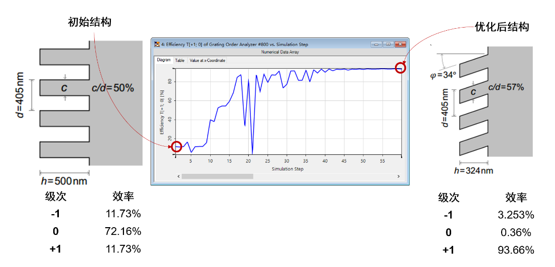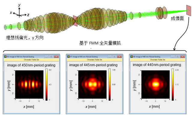 通過高速物理光學,可以對1D和2D微納光柵進行嚴格的電磁分析,獲得相應的近場、衍射級次以及衍射效應,同時能夠對光柵進行優化,以獲得所需要光柵結構參數并集成到整個光學系統中進行分析。