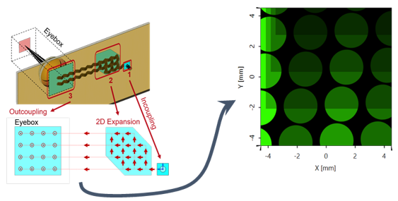 針對AR,VR以及MR應用,VirtualLab Fusion為用戶提供了多通道波導成像系統的非序列建模技術,建模過程中能夠對波前差、能流以及PSF/MTF進行評估。