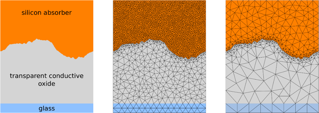 薄膜硅太陽能電池依靠散射結構將入射光衍射到更大的角度,從而在高折射率吸收材料中通過全內反射捕獲光。它們的優化是當前研究的一個課題。一般來說,即使散射結構在本質上是統計性質的,也可以在JCMsuite軟件中通過應用周期邊界條件對單元進行建模,也可以對簡單、隨機紋理薄膜太陽能電池進行幾何定義和網格劃分,進而對不同層材料的衍射、吸收效率進行分析。