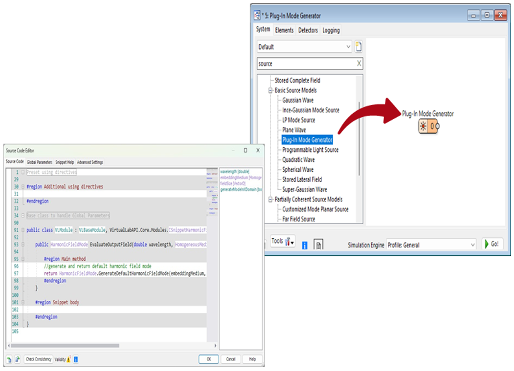 • 插件模式生成器支持用戶(hù)通過(guò)直觀(guān)的C#腳本在x域或k域中自定義橫向場(chǎng),將高級(jí)語(yǔ)言的靈活性與即用型物理計(jì)算結(jié)果完美結(jié)合。