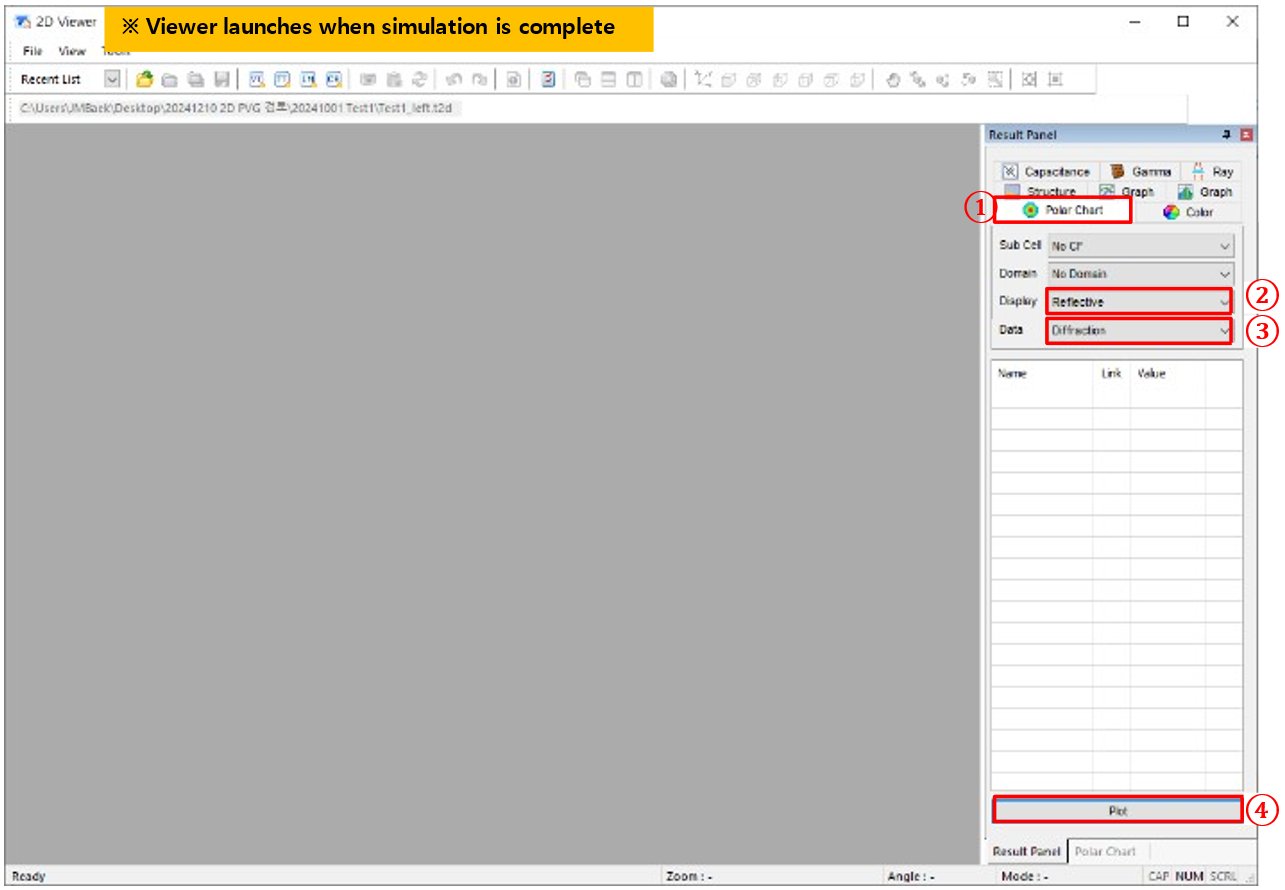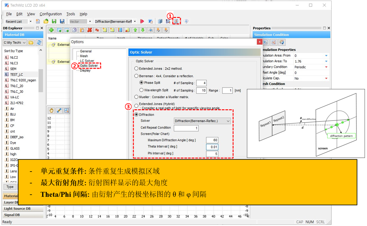 a) ① 仿真條件→ ② 設(shè)置仿真屬性 → ③ 選擇光學(xué)求解器 (Diffraction(Berreman Reflec.))