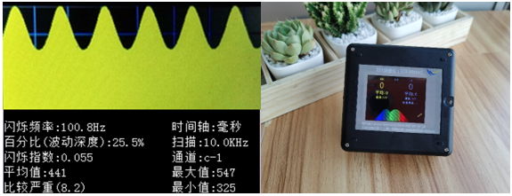 波動深度是本機測量的主要指標,下圖非常典型的頻閃波動波形,最后一欄評價頻閃的嚴重程度:本例為比較嚴重(8.2)。
