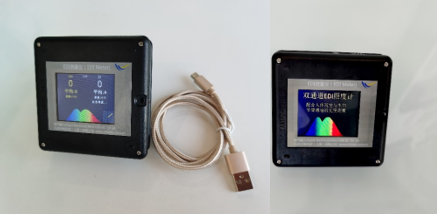 查看詳細結果,按中間鍵,首先顯示右下圖,顯色指數(shù)Ra,R1-R15。再按中間鍵,切換到光譜能量統(tǒng)計和照度、輻照度、EML EDI值;PPFD是光量子密度圖中該數(shù)據(jù)為18.571 umol/m^2/S。藍光輻照度是根據(jù)IEC 62471:2006對藍光危害光譜加權函數(shù)與光譜能量分布卷積的結果。為了便于對光譜應用,給出個了UVA和100nm間隔的波長區(qū)間的能量分布百分比。