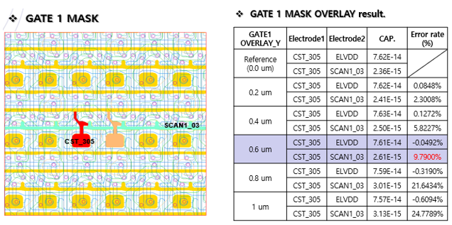 可以將結構參數設置為變量,執行高級工藝余量分析,如圖顯示了根據柵極掩膜的覆蓋率的電容結果,通過使用split選項,工程師可以通過門極掩膜的未對準來預測錯誤率。